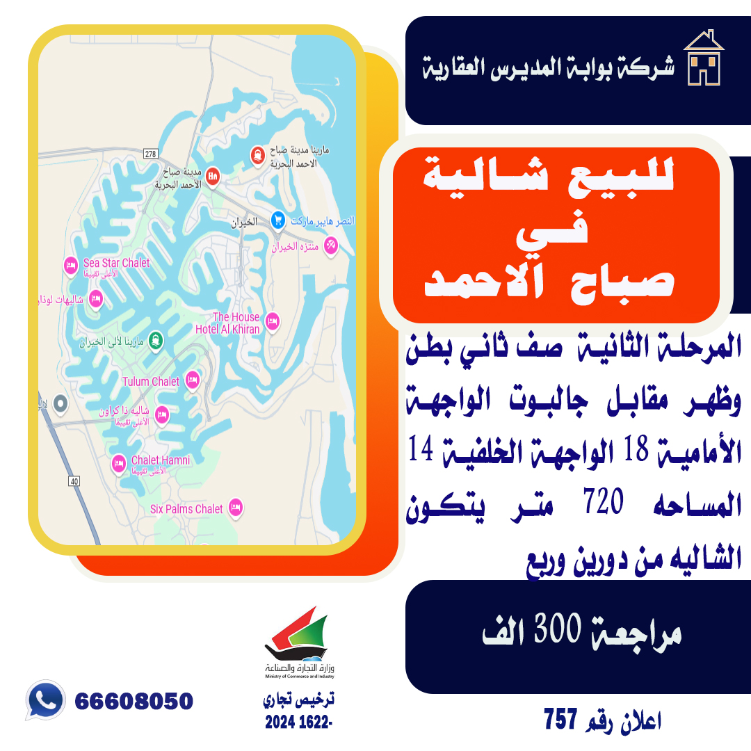 للبيع شاليه فى صباح الاحمد البحرية بالمرحلة الثانية ، موقع صف ثاني يقع على بطن وظهر مقابل جالبوت الواجهة الأمامية 18 متر الواجهة الخلفية 14 متر ، مساحته 720 متر مربع ، يتكون الشاليه من دورين وربع ، الدور الأرضي ديوانية و حمام ، غرفة حارس و حمام ، غرفتين ماستر ، صالة ، حمام ضيوف ، مطبخ ، الدور الاول 4 غرف ماستر ، صالة الربع عبارة عن غرفة الخدم مع حمامه وحمام سباحه ، حديقة مقابل جالبوت ، السعر مراجعه 300 ألف شركة بوابة المديرس العقارية اعلان رقم 757