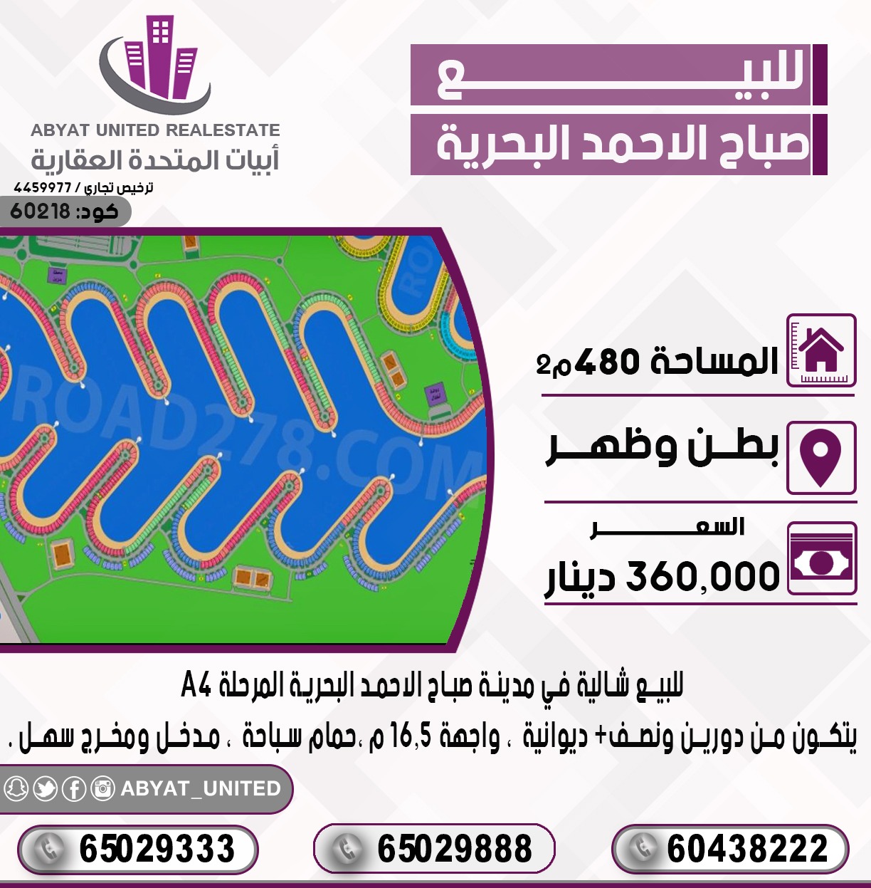 للبيع شالية فى مدينة صباح الاحمد البحرية ، المرحلة A4 ، الموقع بطن وظهر ، المساحة 480 متر مربع ، يتكون من دورين ونصف ، ديوانية ، واجهة 16.5 متر ، حمام سباحة ، مدخل ومخرج سهل ،