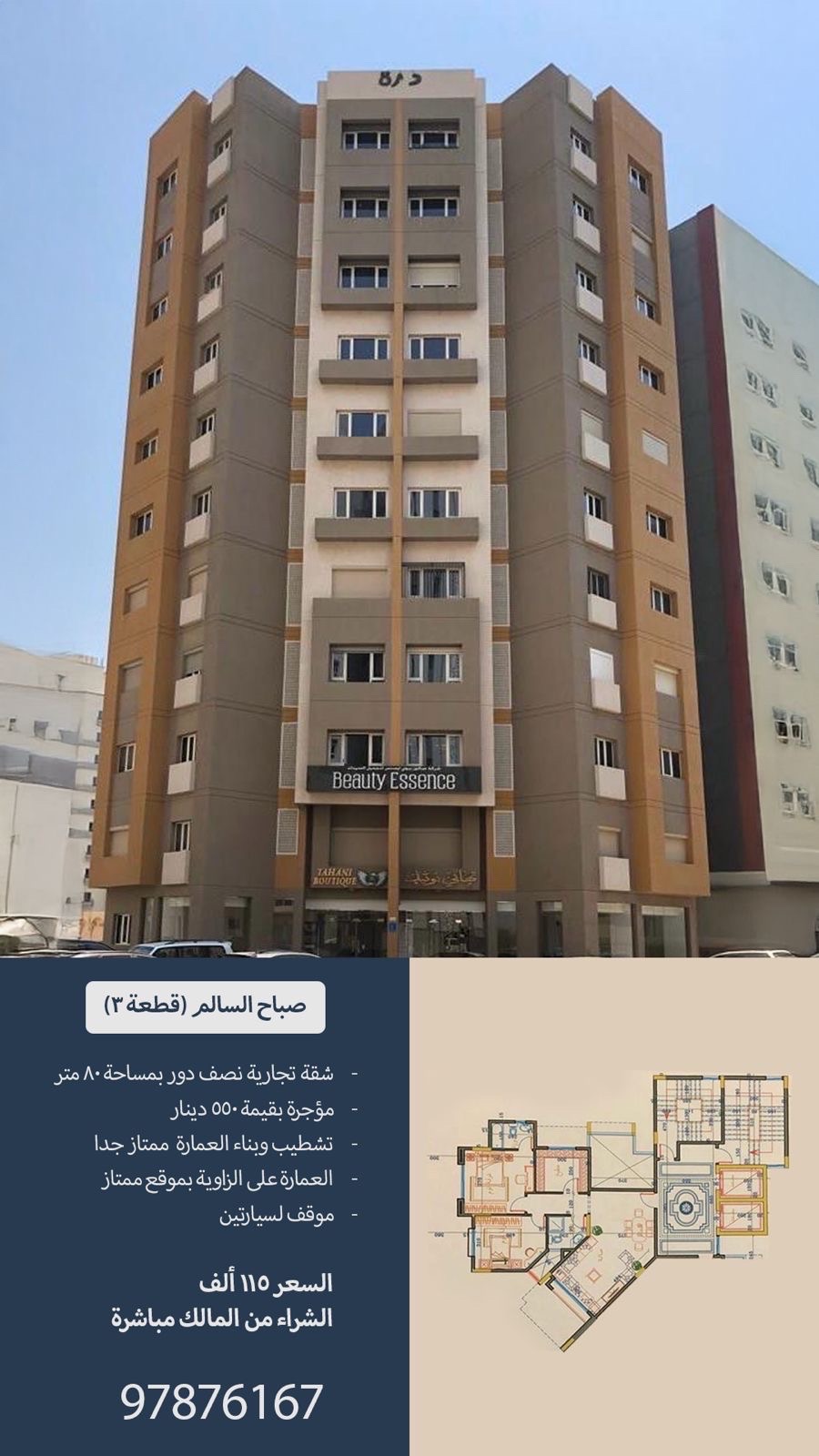 للبيع شقة تجارية نصف دور ، مساحتها 80 متر متر مربع ، عمارة الدرة الدور الأول ، ⁠مؤجرة بقيمة 550 دينار ، تشطيب وبناء العمارة ممتاز جدا من قبل بيت التمويل الكويتي ، ⁠العمارة على الزاوية بموقع ممتاز ، ⁠موقف لسيارتين ، ⁠السعر 115 ألف د.ك ، ⁠الشراء من المالك مباشرة