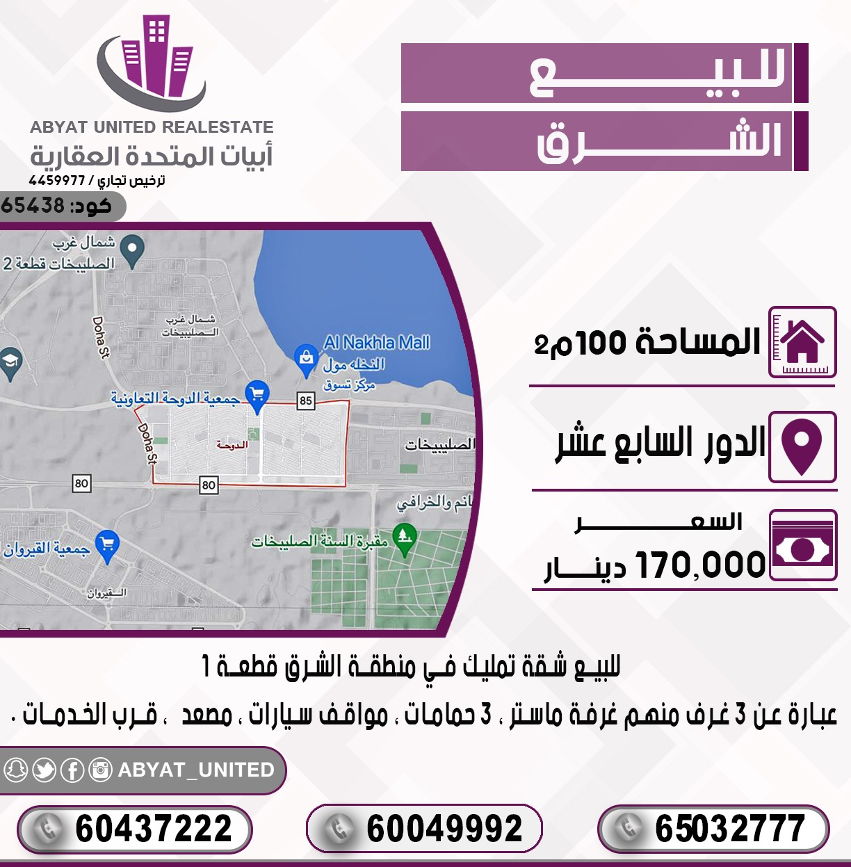 للبيع شقة تمليك فى منطقة شرق قطعة 1 ، الدور السابع عشر ، مساحتها 100 متر مربع ، عبارة عن 3 غرف منهم غرفة ماستر ، 3 حمامات ، مواقف سيارات ، مصعد ، قرب الخدمات .