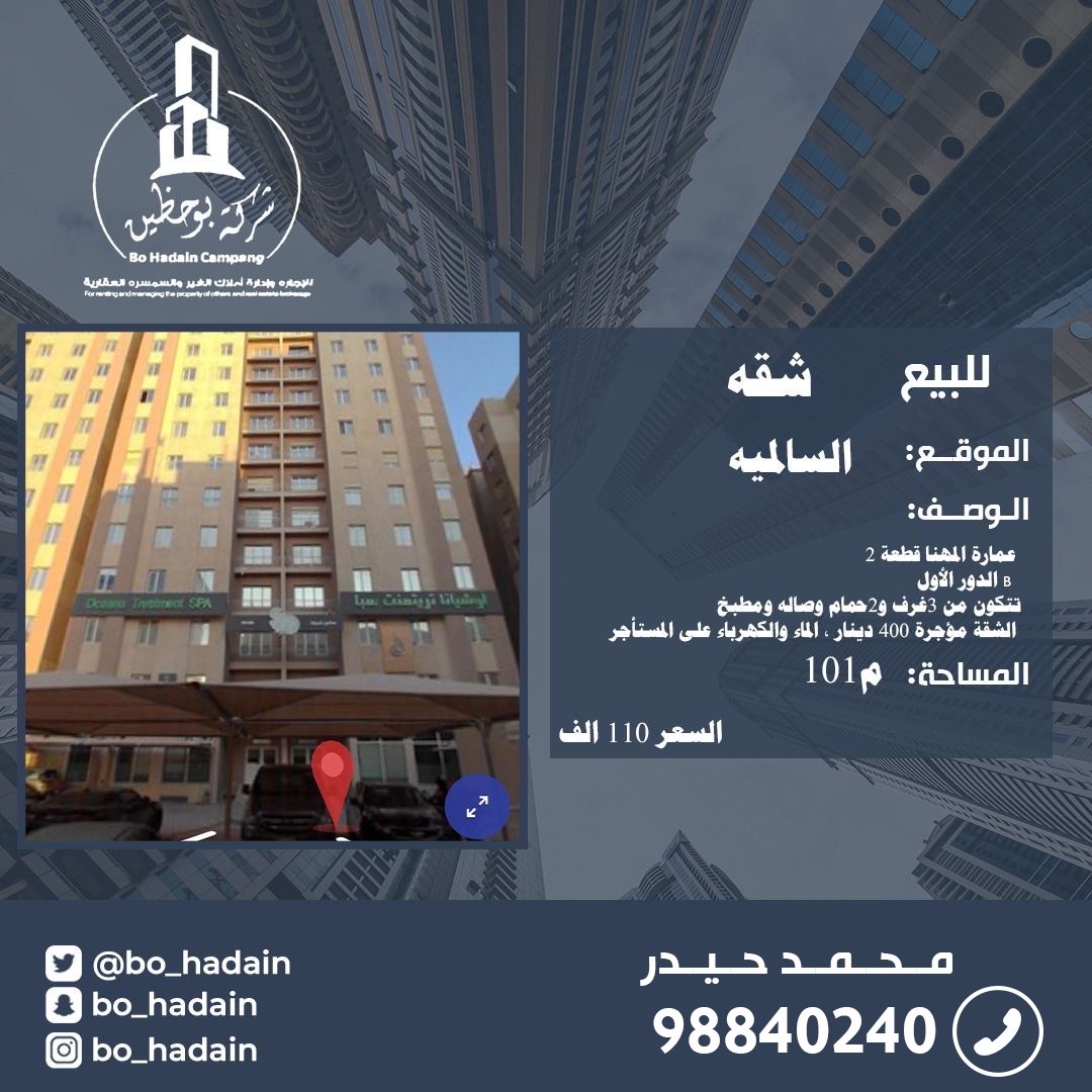عمارة المهنا قطعة 2 بالدور الأول ، تتكون من 3 غرف و 2 حمام وصالة ومطبخ ، الشقة مؤجرة 400 دينار الماء والكهرباء على المستأجر ، السعر 110 ألف د.ك