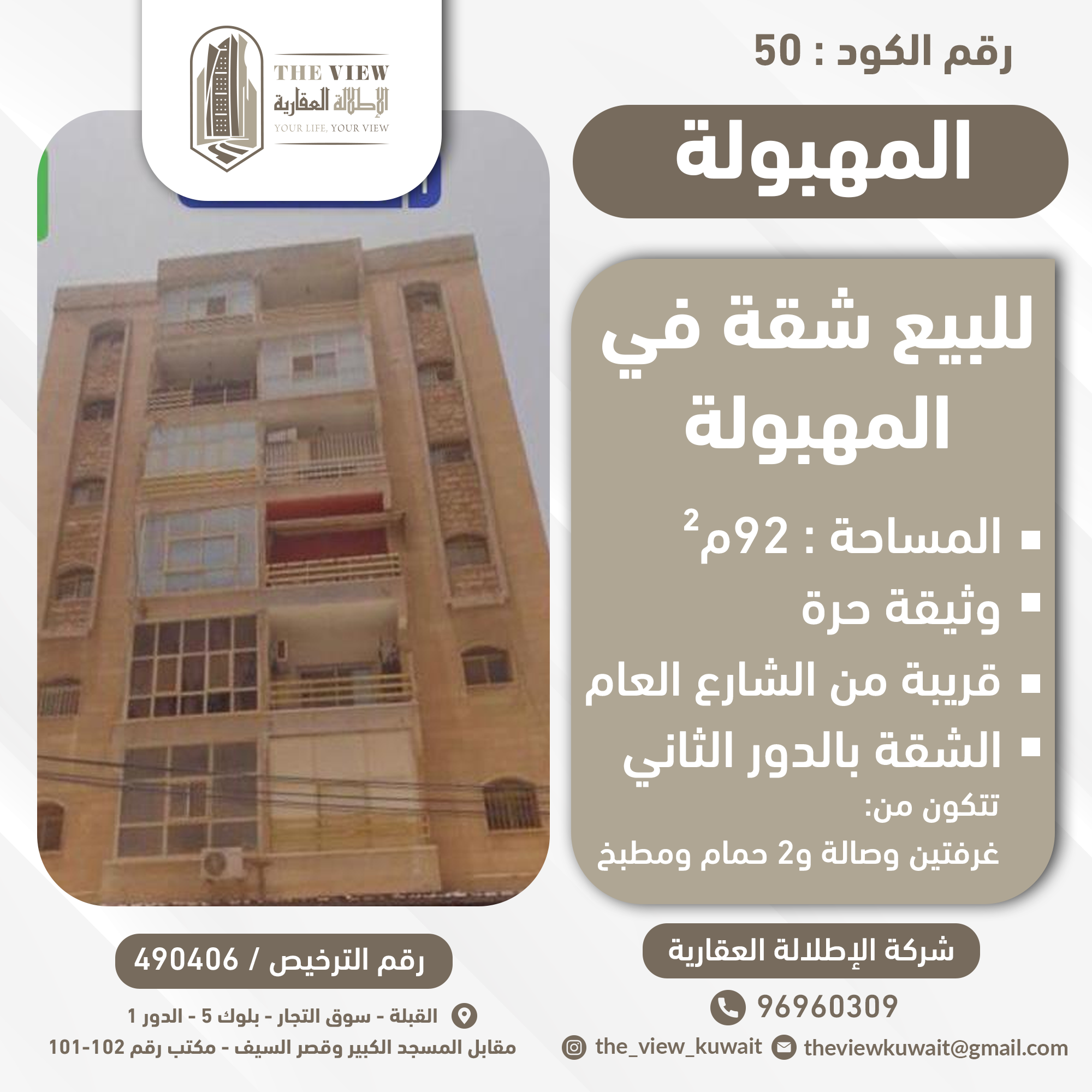 للبيع شقة فى المهبولة دور ثانى Share ملخص للبيع شقة فى المهبولة ، مساحتها 92 متر مربع ، يوجد وثيقة حرة ، قريبة من الشارع العام ، الشقة بالدور الثاني تتكون من غرفتين وصالة و2 حمام ومطبخ . للتواصل 55683559 مهندس محمد التفاصيل حالة: للبيع Page Views الأماكن القريبة من جوجل خصائص ذات صلة للبيع تجربة عنصر للبيع abdulrahman منذ 3 أسابيع للبيع بيت هدام للبيع في الدسمه admin منذ شهر واحد Close