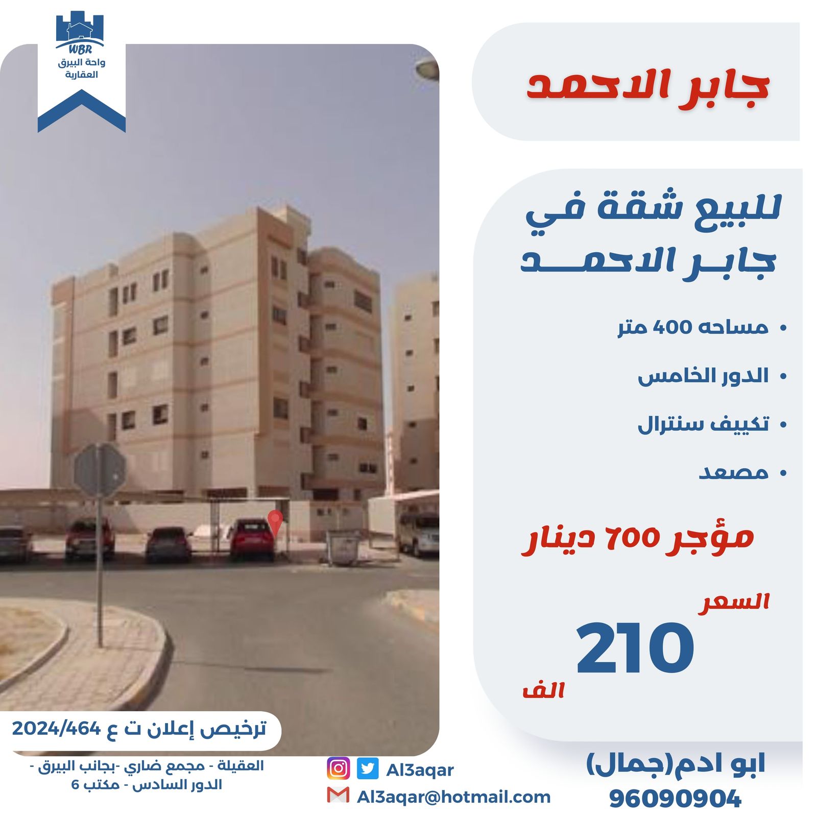 للبيع شقة فى جابر الاحمد Share ملخص للبيع شقه فى جابر الاحمد ، المساحه 400 متر مربع ، الدور الخامس ، مؤجر 700 د.ك ، تكييف سنترال ، مصعد ، السعر 210 ألف د.ك التفاصيل Page Views الأماكن القريبة من جوجل Close