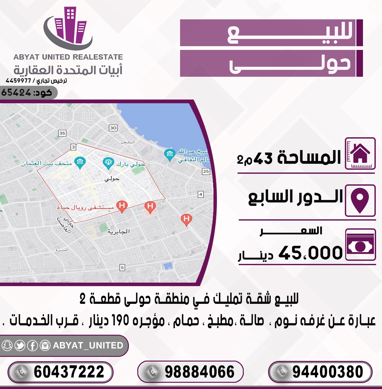 للبيع شقة فى منطقة حولي قطعه 2 ، تقع على الدور السابع ، مساحتها 43 متر مربع ، عبارة عن غرفة نوم ، صالة ، مطبخ ، حمام ، مؤجرة 190 دينار ، قرب الخدمات .
