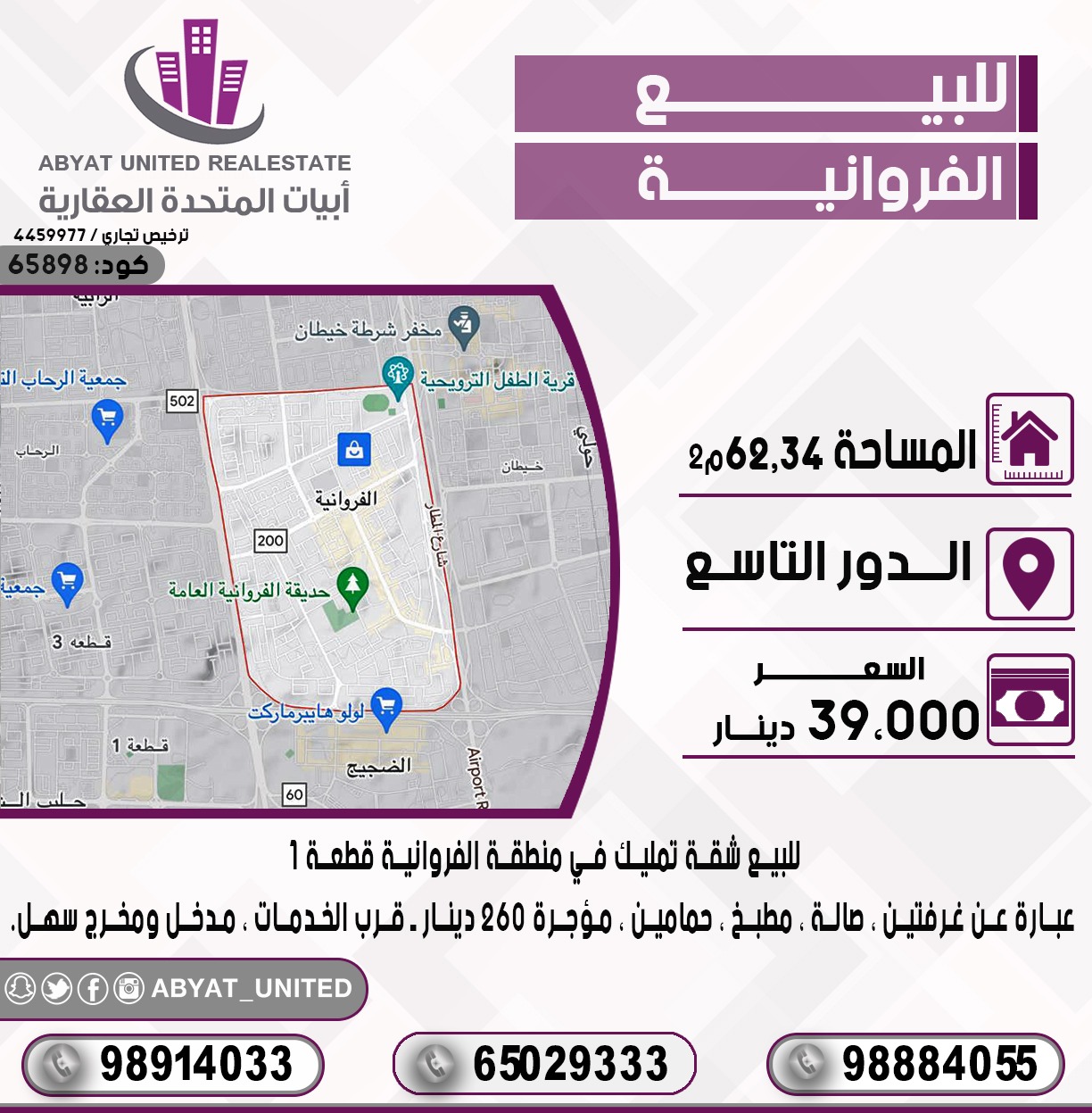 للبيع شقة فى منطقه الفروانية ، قطعه 1 ، الدور التاسع ، المساحة 62.34 متر مربع ، عبارة عن غرفتين ، صاله ، مطبخ ، حمامين ، مؤجرة 260 د.ك ، قرب الخدمات ، مدخل ومخرج سهل ،