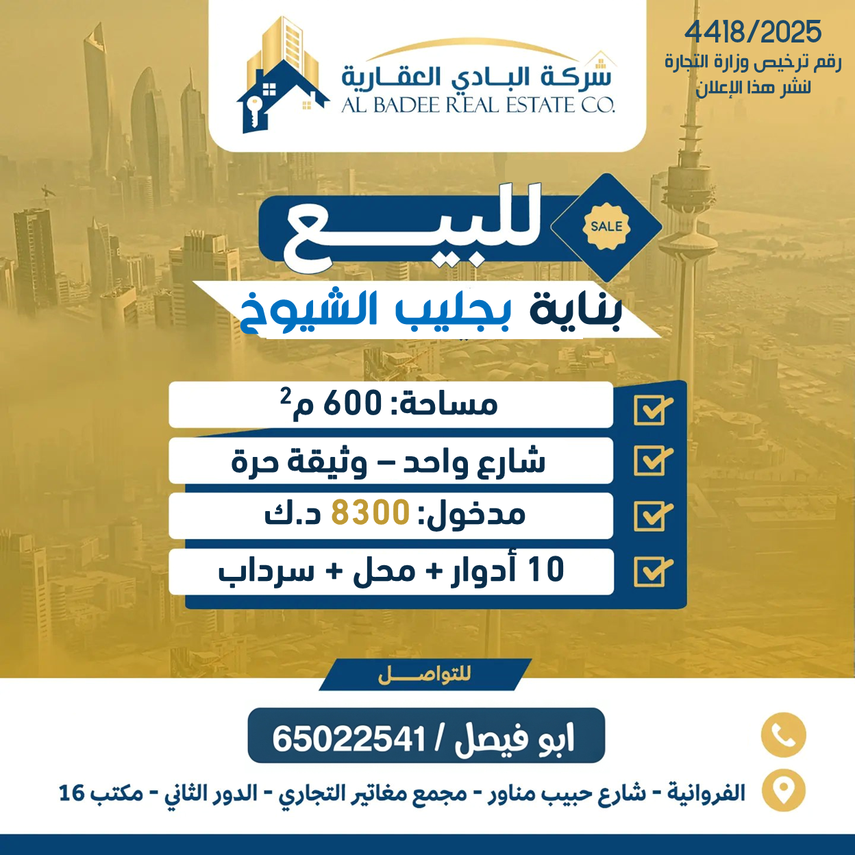 للبيع عمارة استثمارية فى جليب الشيوخ قطعة 2 ، مساحتها 600 متر مربع ، تقع على شارع واحد ، تتكون من 10 أدوار و محل و سرداب و 40 شقة ، دخل 8300 د.ك و وثيقة حرة و بدون مخالفات ، استثمار جاهز ودخل ممتاز ، السعر مراجعة 1,200,000 د.ك ، للتواصل 65022541 ترخيص 2025.4418