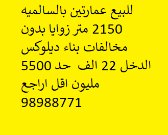 للبيع عمارتين بالسالميه ، مساحتهم 2150 متر مربع ، تقع على زاوية ، بدون مخالفات بناء ديلوكس ، الدخل 22 ألف د.ك ، السعر حد 5500 مليون د.ك اقل اراجع 98988771