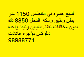 للبيع عماره بالفنطاس بطن وظهر وسكة Share ملخص للبيع عماره فى الفنطاس ، مساحتها 1150 متر مربع ، تقع على بطن وظهر وسكه ، الدخل 8850 د.ك ، بدون مخالفات نظام بنايتين ، وثيقه واحده ، ديلوكس مؤجره عائلات 98988771 التفاصيل حالة: للبيع Page Views الأماكن القريبة من جوجل خصائص ذات صلة للبيع تجربة عنصر للبيع abdulrahman منذ 3 أسابيع للبيع د.ك111111 شقة تجربة عقار جديد خليل بوست أسرة: 666666 الحمامات: 666666 admin منذ 4 أسابيع Close