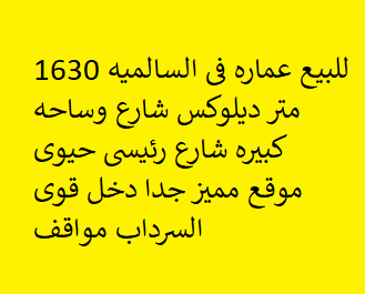 للبيع عماره فى السالميه على شارع رئيسى Share ملخص للبيع عماره فى السالميه ، مساحتها 1630 متر مربع ، تشطيب ديلوكس ، تقع على شارع وساحه كبيره شارع رئيسى حيوى موقع مميز جدا الدخل قوى ، السرداب مواقف . للتواصل 98988771 التفاصيل حالة: للبيع Page Views الأماكن القريبة من جوجل خصائص ذات صلة للبيع تجربة عنصر للبيع abdulrahman منذ أسبوعين للبيع د.ك111111 شقة تجربة عقار جديد خليل بوست أسرة: 666666 الحمامات: 666666 admin منذ 3 أسابيع Close