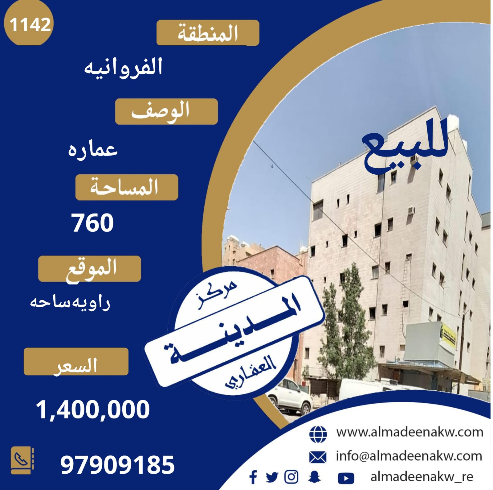 للبيع عماره فى الفروانيه ، تقع على زاوية ساحة ، مساحتها 760 متر مربع ، نص عمر مؤجره بالكامل البيع مليون و 400 ألف دينار