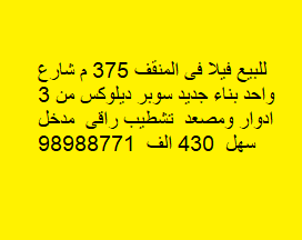 للبيع فيلا بناء جديد بالمنقف Share ملخص للبيع فيلا فى المنقف مساحتها 375 م شارع واحد بناء جديد سوبر ديلوكس تتكون من 3 ادوار ومصعد تشطيب راقى مدخل سهل ، السعر 430 الف . للتواصل 98988771 التفاصيل حالة: للبيع Page Views الأماكن القريبة من جوجل خصائص ذات صلة للبيع تجربة عنصر للبيع abdulrahman منذ أسبوعين للبيع د.ك111111 شقة تجربة عقار جديد خليل بوست أسرة: 666666 الحمامات: 666666 admin منذ 3 أسابيع Close