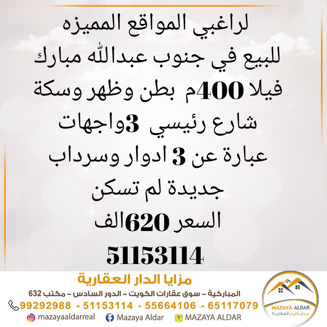 لراغبي المواقع المميزه ، للبيع فيلا فى جنوب عبدالله المبارك ، مساحتها 400 متر مربع ، تقع على بطن وظهر وسكة شارع رئيسي3 واجهات ، تتكون من 3 أدوار وسرداب ، جديدة لم تسكن ، السعر 620 ألف د.ك .