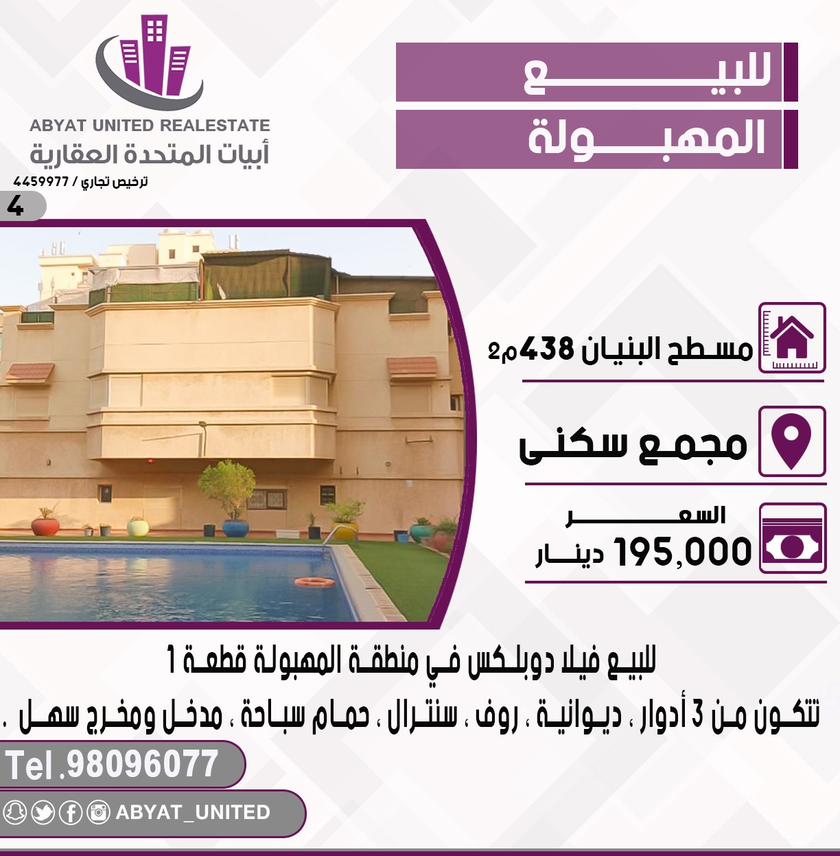 للبيع فيلا دوبلكس فى منطقة المهبوله قطعه 1 ، مجمع سكني ، المساحة 438 متر مربع ، تتكون من 3 ادوار ، ديوانية ، روف ، سنترال ، حمام سباحة ، مدخل ومخرج سهل ، للاستفسار النقال 1 98096077 ، السعر 195 ألف د.ك ،