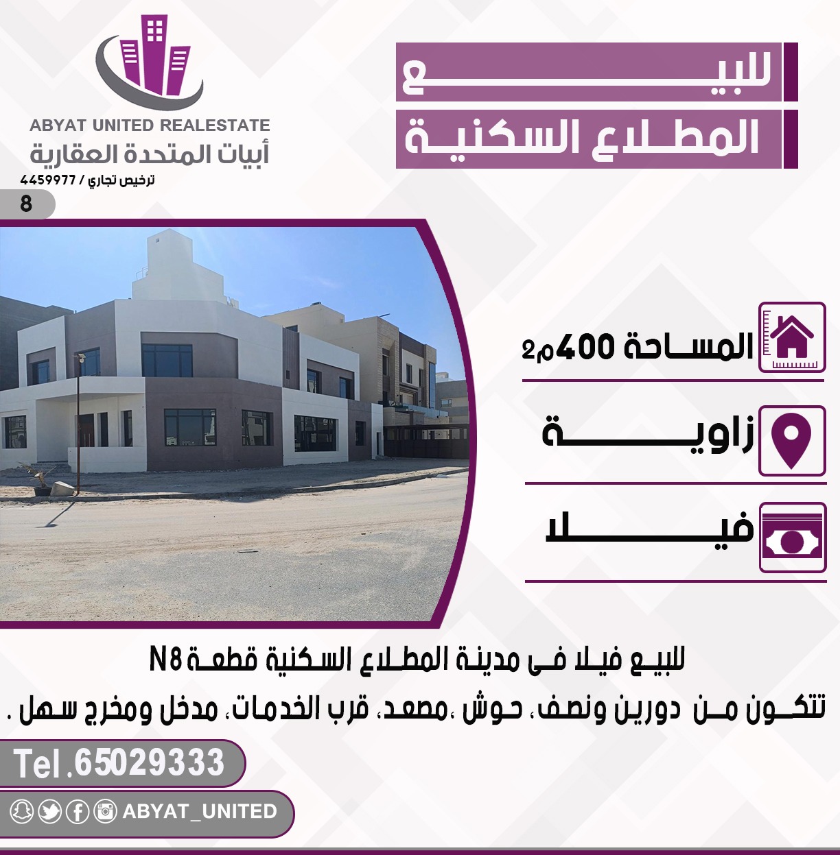 للبيع فيلا زاويه فى المطلاع Share ملخص للبيع فيلا فى مدينة المطلاع ، قطعة N8 ، الموقع زاوية ، المساحة 400 متر مربع ، تتكون من دورين ونصف ، حوش ، مصعد ، قرب الخدمات ، مدخل ومخرج سهل ، للاستفسار النقال 1 65029333 التفاصيل حالة: للبيع Page Views الأماكن القريبة من جوجل خصائص ذات صلة للبيع تجربة عنصر للبيع abdulrahman منذ 3 أسابيع للبيع د.ك111111 شقة تجربة عقار جديد خليل بوست أسرة: 666666 الحمامات: 666666 admin منذ 4 أسابيع Close