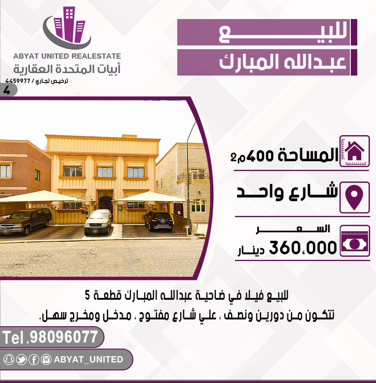 للبيع فيلا ضاحية عبدالله المبارك Share ملخص للبيع فيلا فى ضاحية عبدالله المبارك ، تقع على شارع واحد ، مساحتها 400 متر مربع ، تتكون من دورين ونصف ، على شارع مفتوح ، قرب الخدمات ، مدخل ومخرج سهل . للاستفسار النقال 1 98096077 السعر 360 الف دينار الكود 4 التفاصيل حالة: للبيع Page Views الأماكن القريبة من جوجل خصائص ذات صلة للبيع تجربة عنصر للبيع abdulrahman منذ أسبوعين للبيع د.ك111111 شقة تجربة عقار جديد خليل بوست أسرة: 666666 الحمامات: 666666 admin منذ 3 أسابيع Close