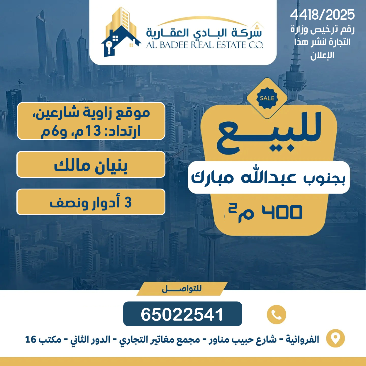للبيع فيلا VIP فاخرة فى جنوب عبدالله المبارك السور موقع زاوية شارعين ، مساحته 400 متر مربع ارتدادان مميزان 13 متر و 6 متر ، بنيان المالك ، المواصفات الرئيسية ، تتكون من 3 أدوار ونص تصميم مودرن إسلامي ، عبارة عن 3 شقق مستقلة و تشطيب فاخر ، يوجد شترات و ستلايت مركزي و إنتركم .
