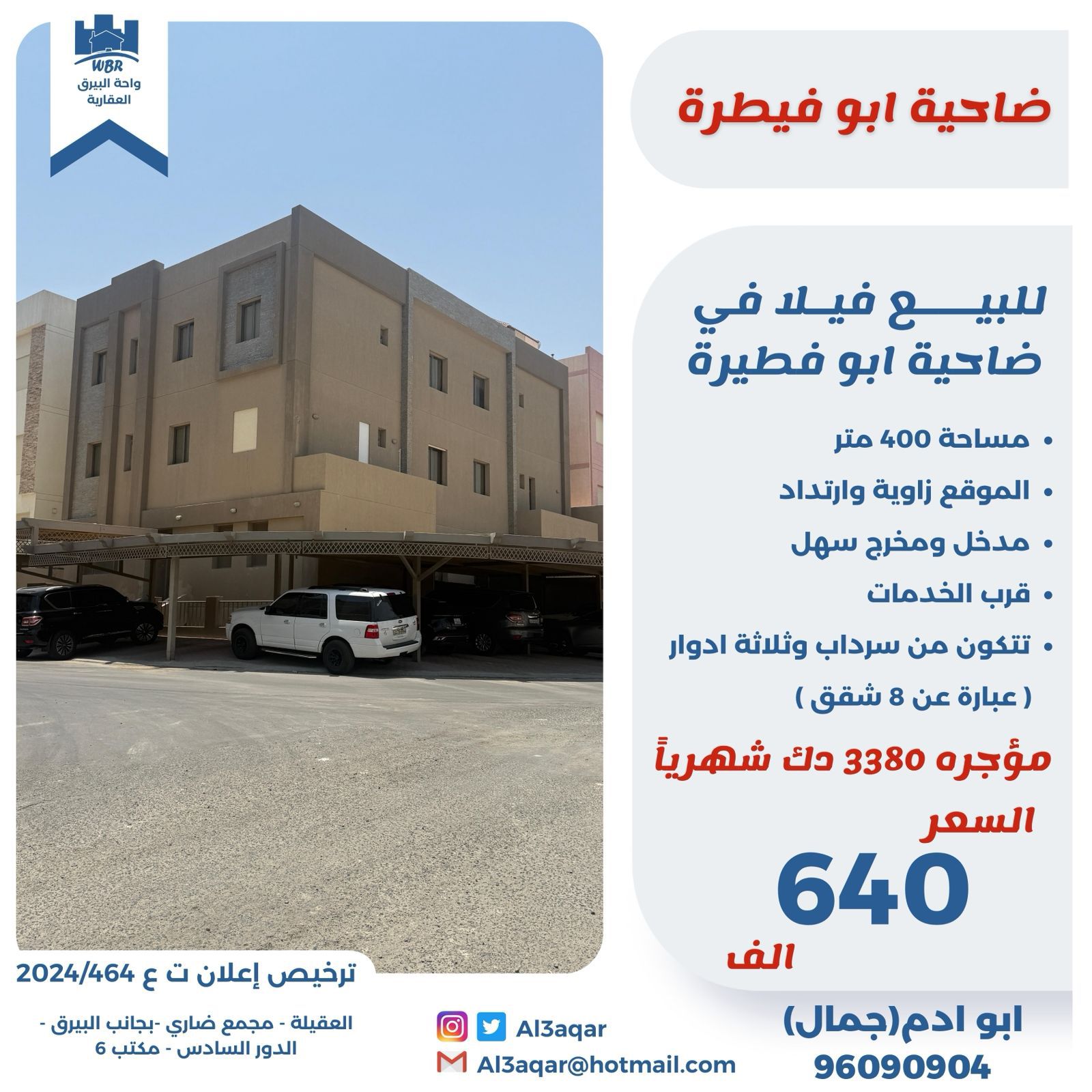 للبيع فيلا فى ابوفطيرة مؤجرة Share ملخص للبيع فيلا فى ضاحية ابو فطيرة مساحتها 400 متر مربع ، تقع على زاوية وارتداد مدخل ومخرج سهل قرب الخدمات تتكون من سرداب وثلاثة أدوار عبارة عن 8 شقق ، مؤجر بسعر 3380 د.ك شهريا ، السعر 640 ألف دينار . التفاصيل حالة: للبيع Page Views الأماكن القريبة من جوجل خصائص ذات صلة للبيع تجربة عنصر للبيع abdulrahman منذ 3 أسابيع للبيع د.ك111111 شقة تجربة عقار جديد خليل بوست أسرة: 666666 الحمامات: 666666 admin منذ 4 أسابيع Close