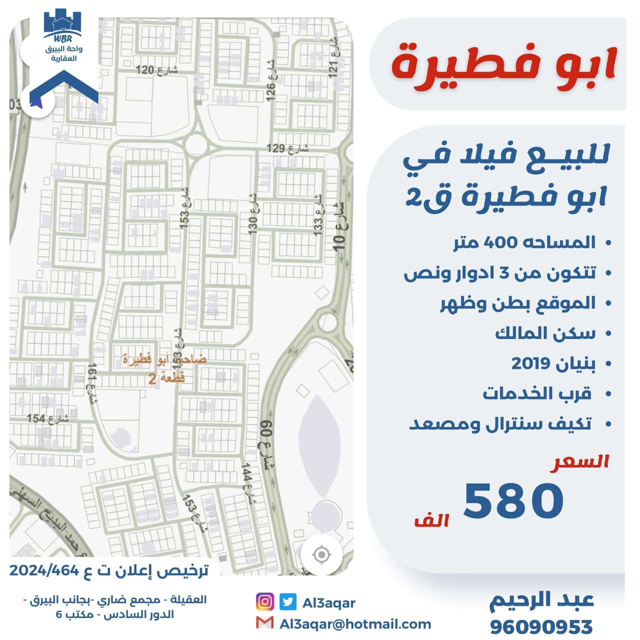 للبيع فيلا فى ابو فطيرة ، قطعة 2 ، المساحة 400 متر مربع ، سكن المالك ، تتكون من 3 ادوار ونص ، بنيان 2019 ، قرب الخدمات ، تكييف سنترال ومصعد ، السعر 580 ألف د.ك