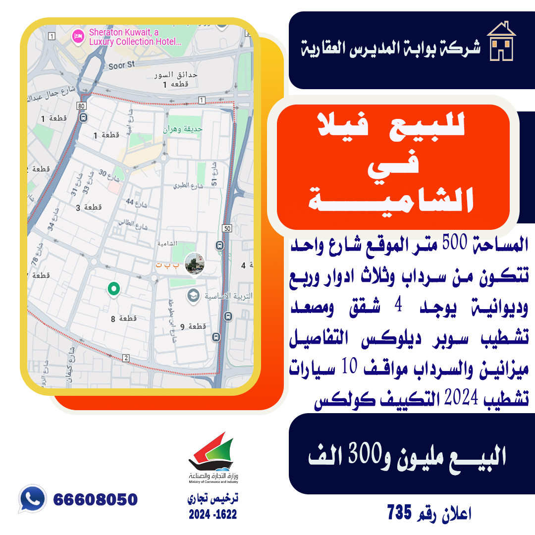 للبيع فيلا فى الشامية ، مساحتها 500 متر مربع ، تقع على شارع واحد ، تتكون من سرداب وثلاث أدوار وربع وديوانية يوجد 4 شقق ومصعد تشطيب سوبر ديلوكس التفاصيل يوجد ميزانين والسرداب مواقف 10 سيارات تشطيب عام 2024 و التكييف كولكس ، البيع 1.3 مليون دينار ، يمنع الوسطاء شركة بوابة المديرس العقارية اعلان رقم 735