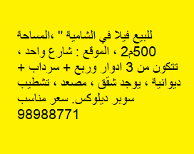 للبيع فيلا فى منطقة الشامية ، المساحة 500 متر مربع ، الموقع شارع واحد ، تتكون من 3 ادوار وربع ، سرداب ، ديوانية ، يوجد شقق ، مصعد ، تشطيب سوبر ديلوكس ، سعر مناسب ، 98988771