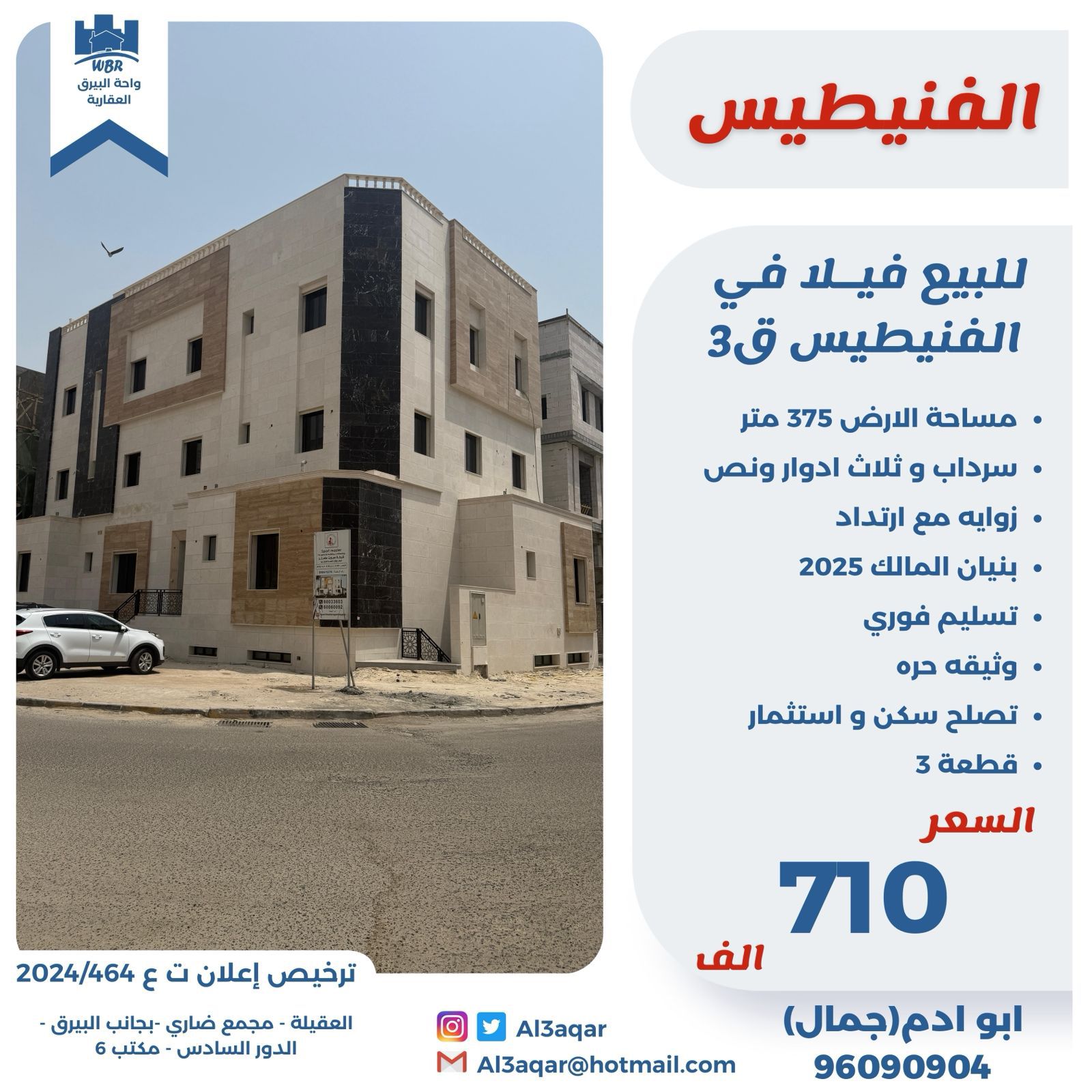 للبيع فيلا فى الفنيطيس سكن وإستثمار Share ملخص للبيع فيلا فى الفنيطيس قطعة 3 ، مساحة الارض 375 متر مربع ، تتكون من سرداب وثلاث أدوار ونص ، تقع على زاوية مع إرتداد ، بنيان المالك عام 2025 ، التسليم فوري والثيقة حرة تصلح سكن والاستثمار ، السعر 710 ألف دينار . التفاصيل حالة: للبيع Page Views الأماكن القريبة من جوجل خصائص ذات صلة للبيع تجربة عنصر للبيع abdulrahman منذ أسبوعين للبيع د.ك111111 شقة تجربة عقار جديد خليل بوست أسرة: 666666 الحمامات: 666666 admin منذ 3 أسابيع Close