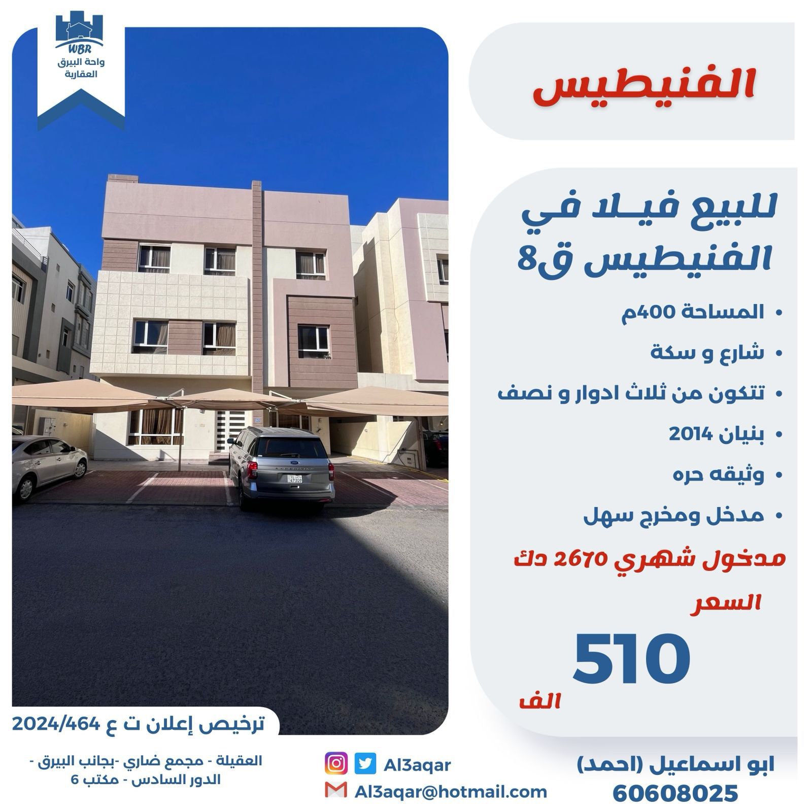 للبيع فيلا فى الفنيطيس قطعه 8 Share ملخص للبيع فيلا فى الفنيطيس قطعة 8 مساحتها 400 متر مربع ، تقع على شارع وسكه تتكون من ثلاث أدوار ونصف بنيان 2014 وثيقة حرة مدخل ومخرج سهل ، مدخول شهري 2670 دينار السعر 510 ألف د.ك التفاصيل حالة: للبيع Page Views الأماكن القريبة من جوجل خصائص ذات صلة للبيع تجربة عنصر للبيع abdulrahman منذ أسبوعين للبيع د.ك111111 شقة تجربة عقار جديد خليل بوست أسرة: 666666 الحمامات: 666666 admin منذ 3 أسابيع Close