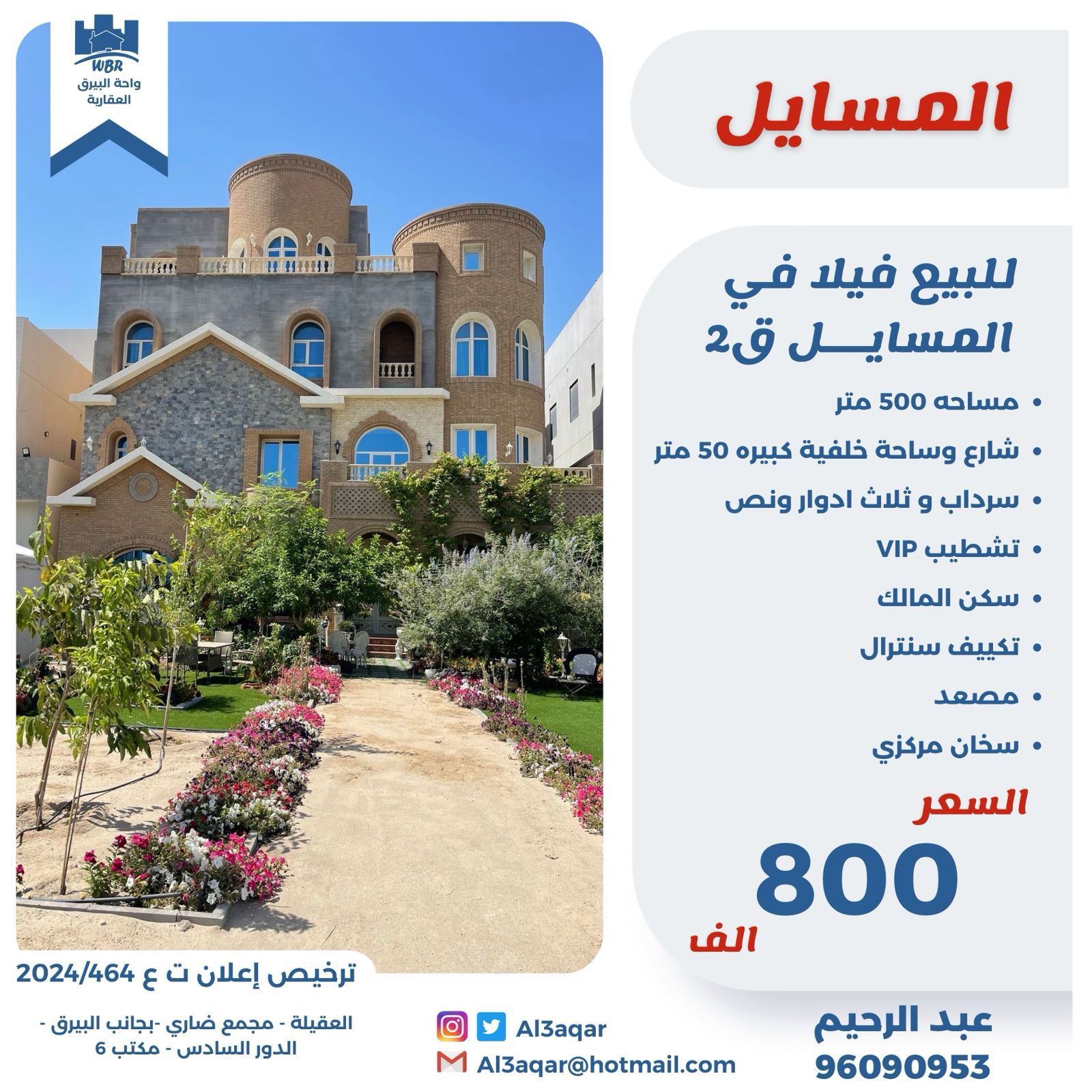 للبيع فيلا فى المسايل سكن المالك Share ملخص للبيع فيلا فى المسايل ، قطعة 2 ، المساحة 500 متر مربع ، تقع على شارع وساحة خلفية كبيرة 50 متر ، تتكون من سرداب وثلاثة ادوار ونص ، تشطيب VIP ، سكن المالك ، مصعد ، سخان مركزي ، تكييف سنترال ، السعر 800 ألف د.ك التفاصيل حالة: للبيع Page Views الأماكن القريبة من جوجل خصائص ذات صلة للبيع تجربة عنصر للبيع abdulrahman منذ 3 أسابيع للبيع د.ك111111 شقة تجربة عقار جديد خليل بوست أسرة: 666666 الحمامات: 666666 admin منذ 4 أسابيع Close