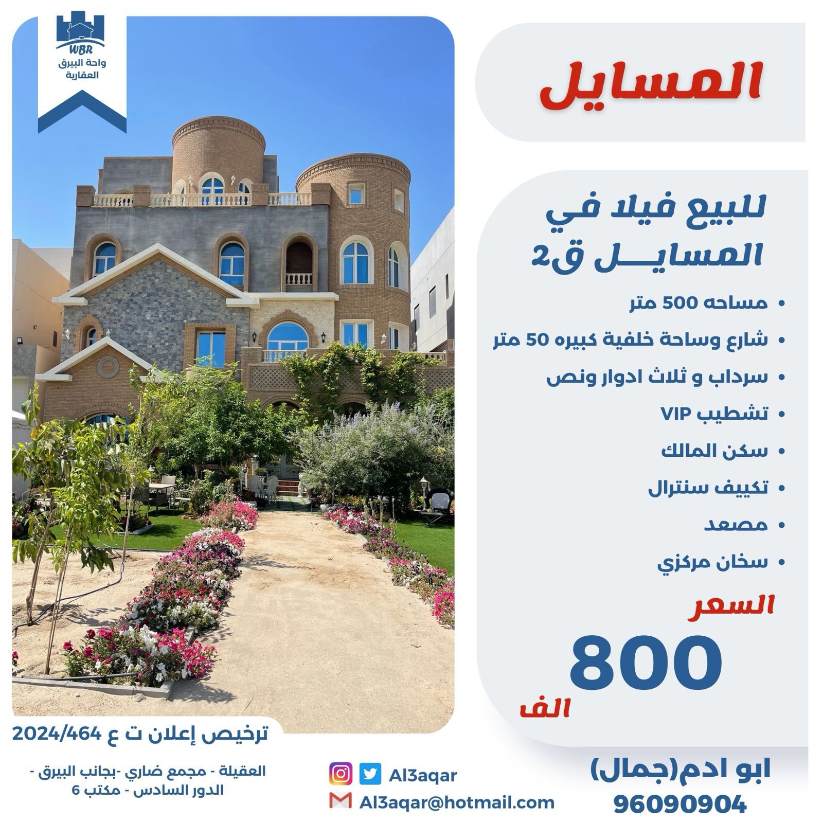 للبيع فيلا فى المسايل قطعة 2 ، المساحة 500 متر مربع ، تقع على شارع وساحة خلفية كبيرة 50 متر ، تتكون من سرداب وثلاثة ادوار ونص تشطيب VIP ، سكن المالك ، مصعد سخان مركزي ، تكييف سنترال ، السعر 800 ألف د.ك