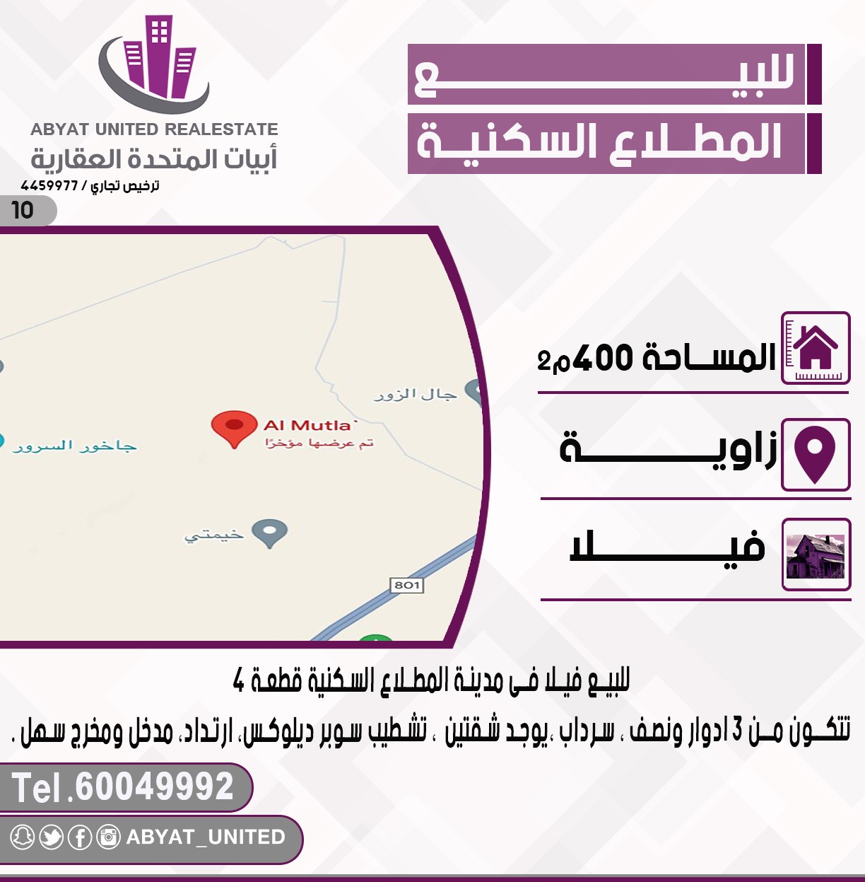 للبيع فيلا فى المطلاع سوبر ديلوكس Share ملخص للبيع فيلا فى مدينة المطلاع السكنية ، قطعة 4 ، المساحة 400 متر مربع ، تتكون من 3 ادوار ونصف ، سرداب ، يوجد شقتين ، تشطيب سوبر ديلوكس ، ارتداد ، مدخل ومخرج سهل ، النقال 1 60049992 التفاصيل حالة: للبيع Page Views الأماكن القريبة من جوجل خصائص ذات صلة للبيع تجربة عنصر للبيع abdulrahman منذ 3 أسابيع للبيع د.ك111111 شقة تجربة عقار جديد خليل بوست أسرة: 666666 الحمامات: 666666 admin منذ 4 أسابيع Close