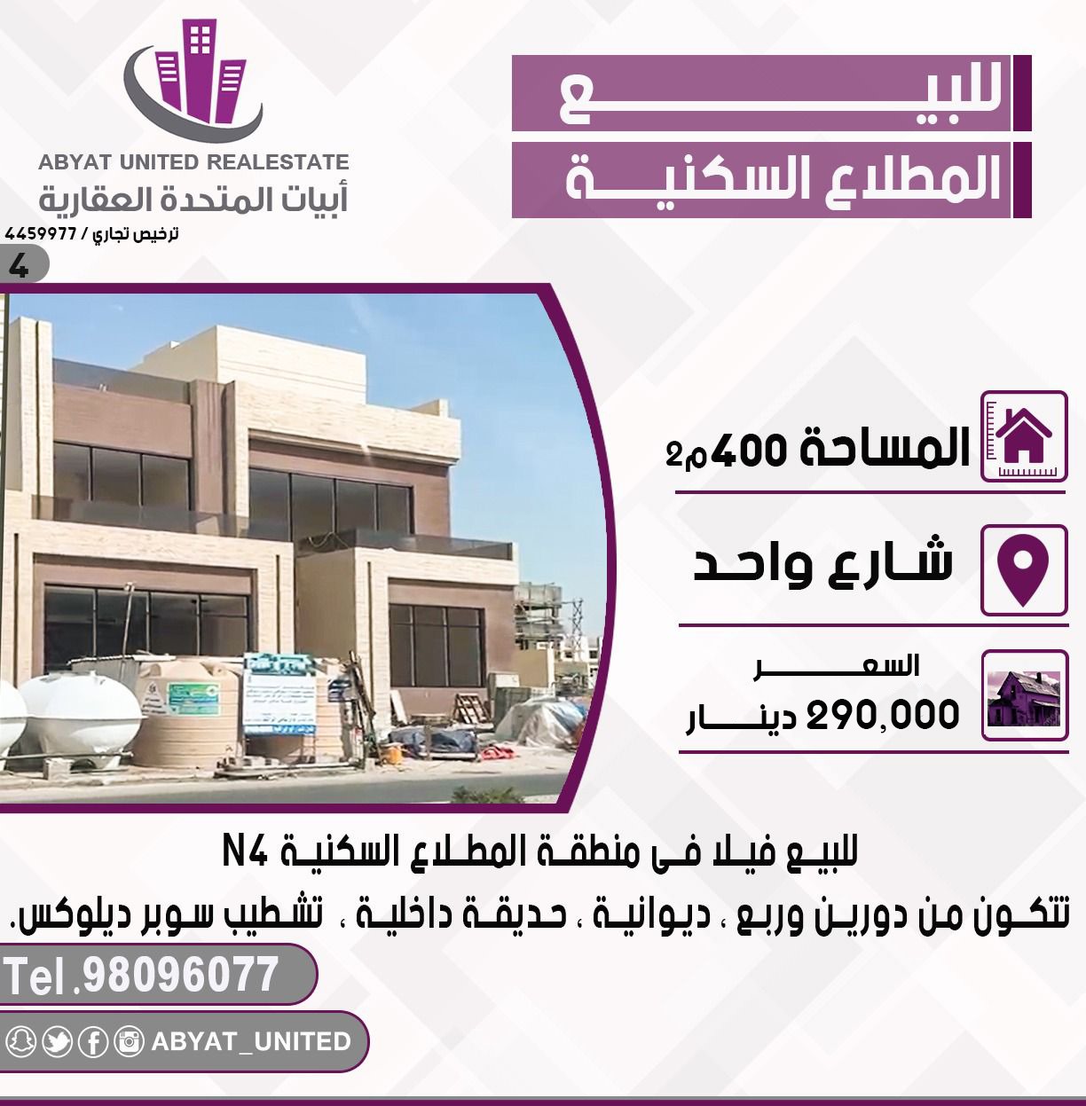 للبيع فيلا فى منطقه المطلاع السكنية N4 ، الموقع شارع واحد ، المساحة 400 متر مربع ، تتكون من دورين وربع ، ديوانية ، حديقة داخلية ، تشطيب سوبر ديلوكس ، للاستفسار النقال 1 98096077 ، السعر 290 ألف د.ك ، الكود 4