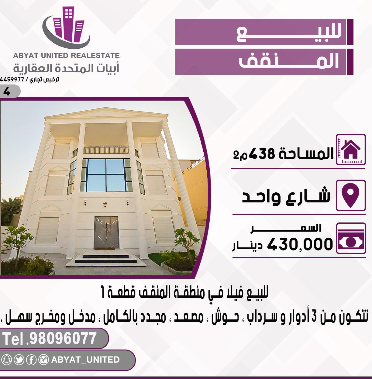 للبيع فيلا فى منطقة المنقف قطعة 1 تقع على شارع واحد ، مساحتها 438 متر مربع ، تتكون من 3 أدوار ، سرداب ، حوش ، مصعد ، مجدد بالكامل ، مدخل ومخرج سهل للإستفسار النقال 1. 98096077 السعر 430 ألف دينار الكود 4