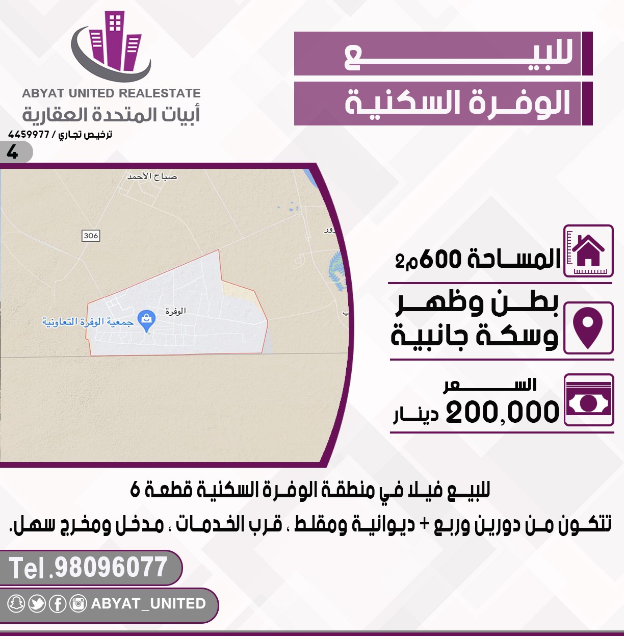 للبيع فيلا فى منطقة الوفرة السكنية ، قطعة 6 ، الموقع بطن وظهر وسكة جانبية ، المساحة 600 متر مربع ، تتكون من دورين وربع ، ديوانية ، مقلط ، قرب الخدمات ، مدخل ومخرج سهل ، للاستفسار النقال 1 98096077 ، السعر 200 ألف د.ك