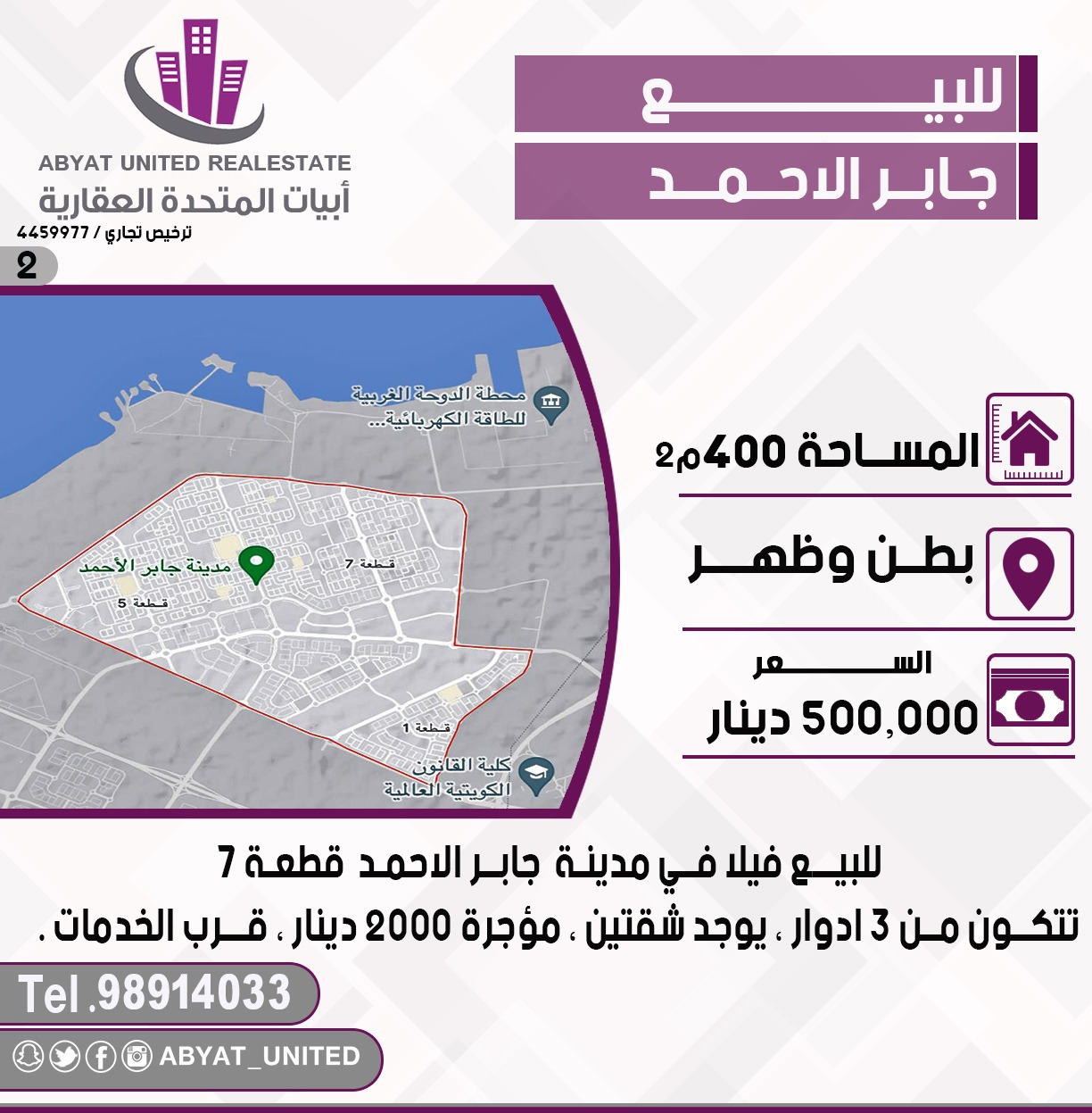 للبيع فيلا فى جابر الاحمد قطعة 7 Share ملخص للبيع فيلا فى مدينة جابر الاحمد قطعه 7 الموقع بطن وظهر ، مساحته 400 متر مربع ، تتكون من 3 أدوار ، يوجد شقتين ، مؤجرة 2000 دينار ، قرب الخدمات . للاستفسار النقال 1 98914033 ، السعر 500 ألف دينار الكود 2 التفاصيل حالة: للبيع Page Views الأماكن القريبة من جوجل خصائص ذات صلة للبيع تجربة عنصر للبيع abdulrahman منذ أسبوعين للبيع د.ك111111 شقة تجربة عقار جديد خليل بوست أسرة: 666666 الحمامات: 666666 admin منذ 3 أسابيع Close