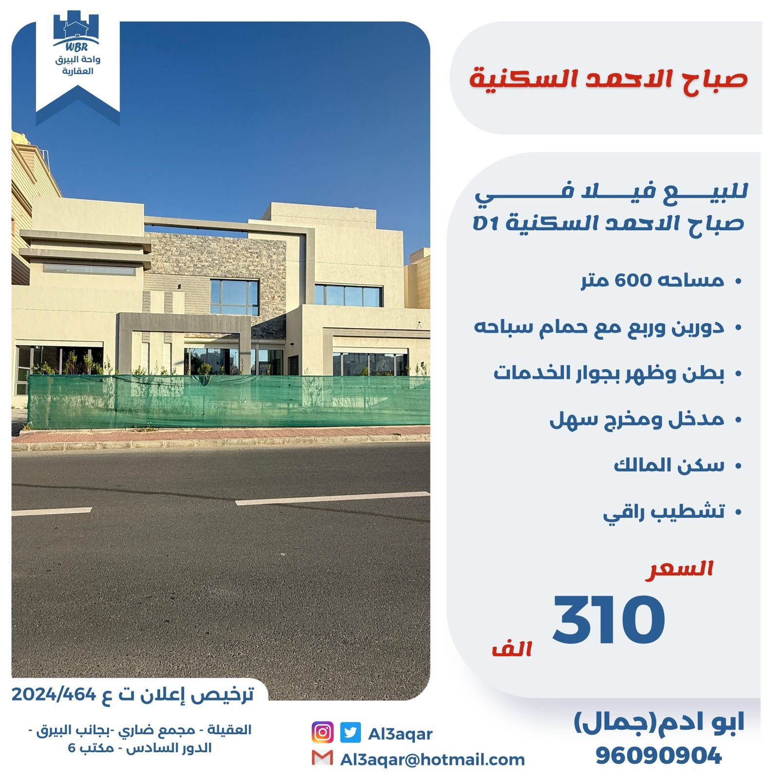 للبيع فيلا فى صباح الاحمد السكنية D1 ، مساحتها 600 متر مربع ، تتكون من دورين وربع مع حمام سباحة ، تقع على بطن وظهر بجوار الخدمات مدخل ومخرج سهل ، سكن المالك تشطيب راقي السعر 310 ألف د.ك .
