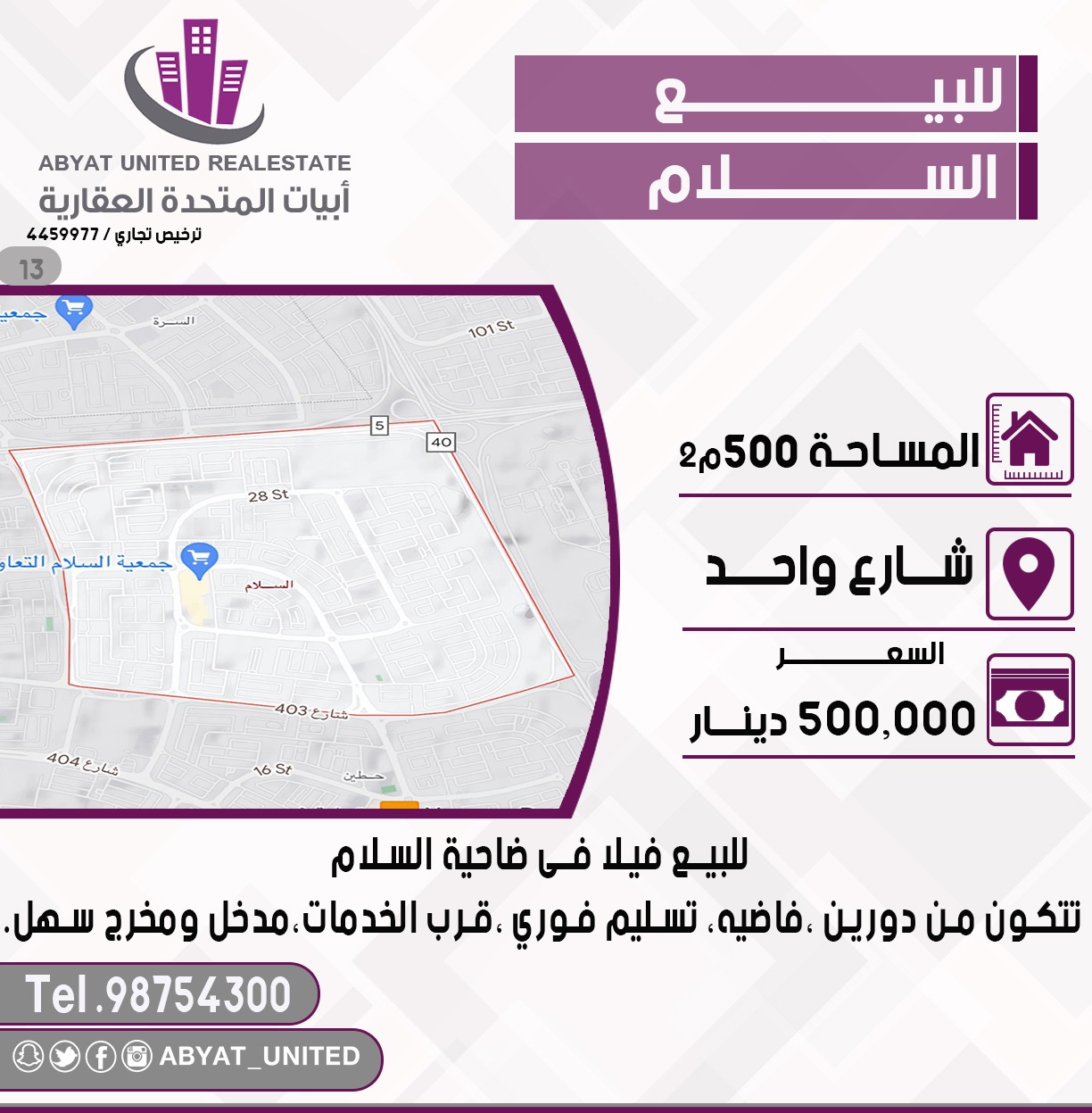 للبيع فيلا فى ضاحية السلام Share ملخص للبيع فيلا فى ضاحية السلام ، الموقع شارع واحد ، المساحة 500 متر مربع ، تتكون من دورين ، فاضيه ، تسليم فوري ، قرب الخدمات ، مدخل ومخرج سهل ، للاستفسار النقال 1 98754300 ، السعر 500 ألف د.ك التفاصيل Page Views الأماكن القريبة من جوجل Close