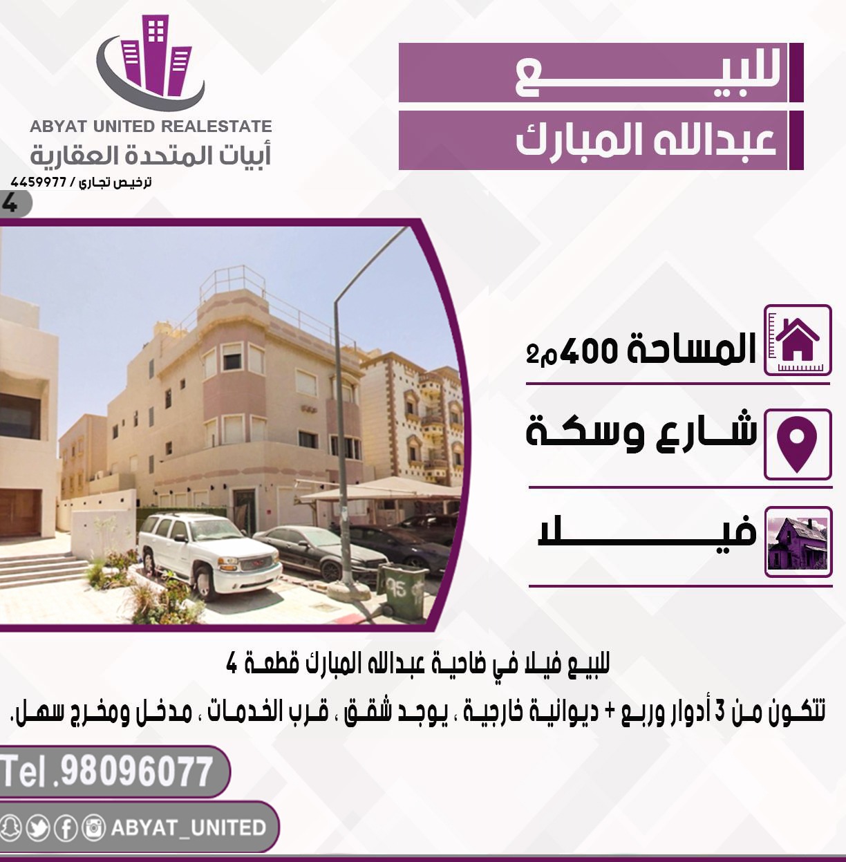 للبيع فيلا فى ضاحية عبدالله المبارك قطعة 4 Share ملخص للبيع فيلا فى ضاحية عبدالله المبارك قطعة 4 ، موقع شارع وسكة ، مساحتها 400 متر مربع ، تتكون من 3 أدوار وربع ، ديوانية خارجية ، يوجد شقق ، قرب الخدمات ، مدخل ومخرج سهل . للاستفسار النقال1 98096077 التفاصيل حالة: للبيع Page Views الأماكن القريبة من جوجل خصائص ذات صلة للبيع تجربة عنصر للبيع abdulrahman منذ أسبوعين للبيع د.ك111111 شقة تجربة عقار جديد خليل بوست أسرة: 666666 الحمامات: 666666 admin منذ 3 أسابيع Close