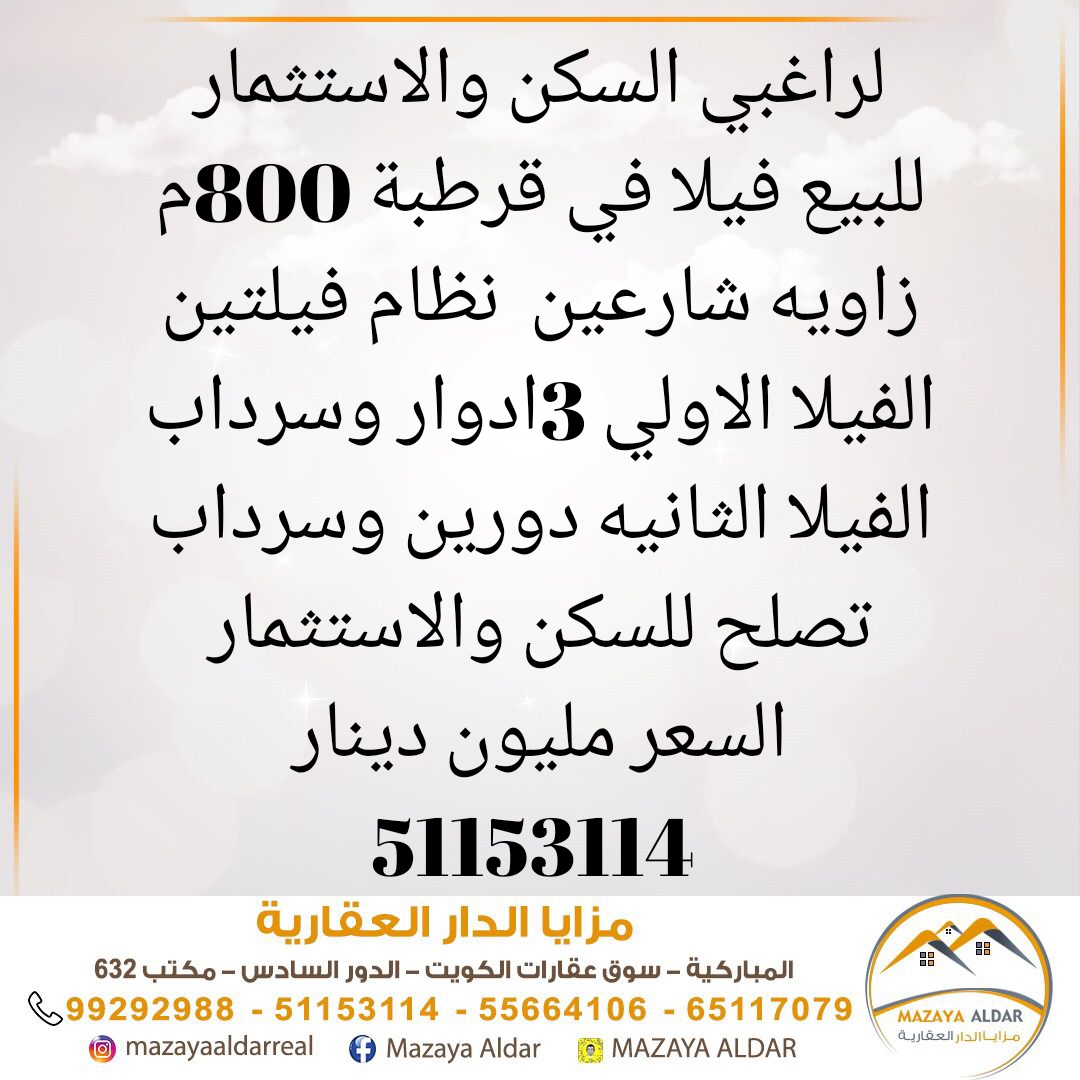 لراغبي السكن والاستثمار ، للبيع فيلا فى قرطبة ، مساحتها 800 متر مربع ، تقع على زاوية شارعين نظام فيلتين