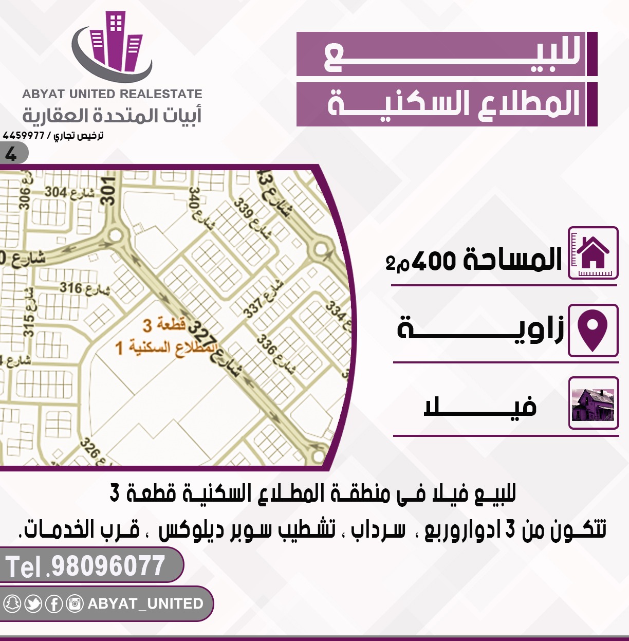 للبيع فيلا فى مدينة المطلاع زاوية Share ملخص للبيع فيلا فى مدينة المطلاع السكنية قطعة 3 ، موقع زاوية ، مساحتها 400 متر مربع ، تتكون من 3 أدوار وربع ، سرداب ، تشطيب سوبر ديلوكس ، قرب الخدمات . للاستفسار النقال1 98096077 التفاصيل حالة: للبيع Page Views الأماكن القريبة من جوجل خصائص ذات صلة للبيع تجربة عنصر للبيع abdulrahman منذ 3 أسابيع للبيع د.ك111111 شقة تجربة عقار جديد خليل بوست أسرة: 666666 الحمامات: 666666 admin منذ 4 أسابيع Close