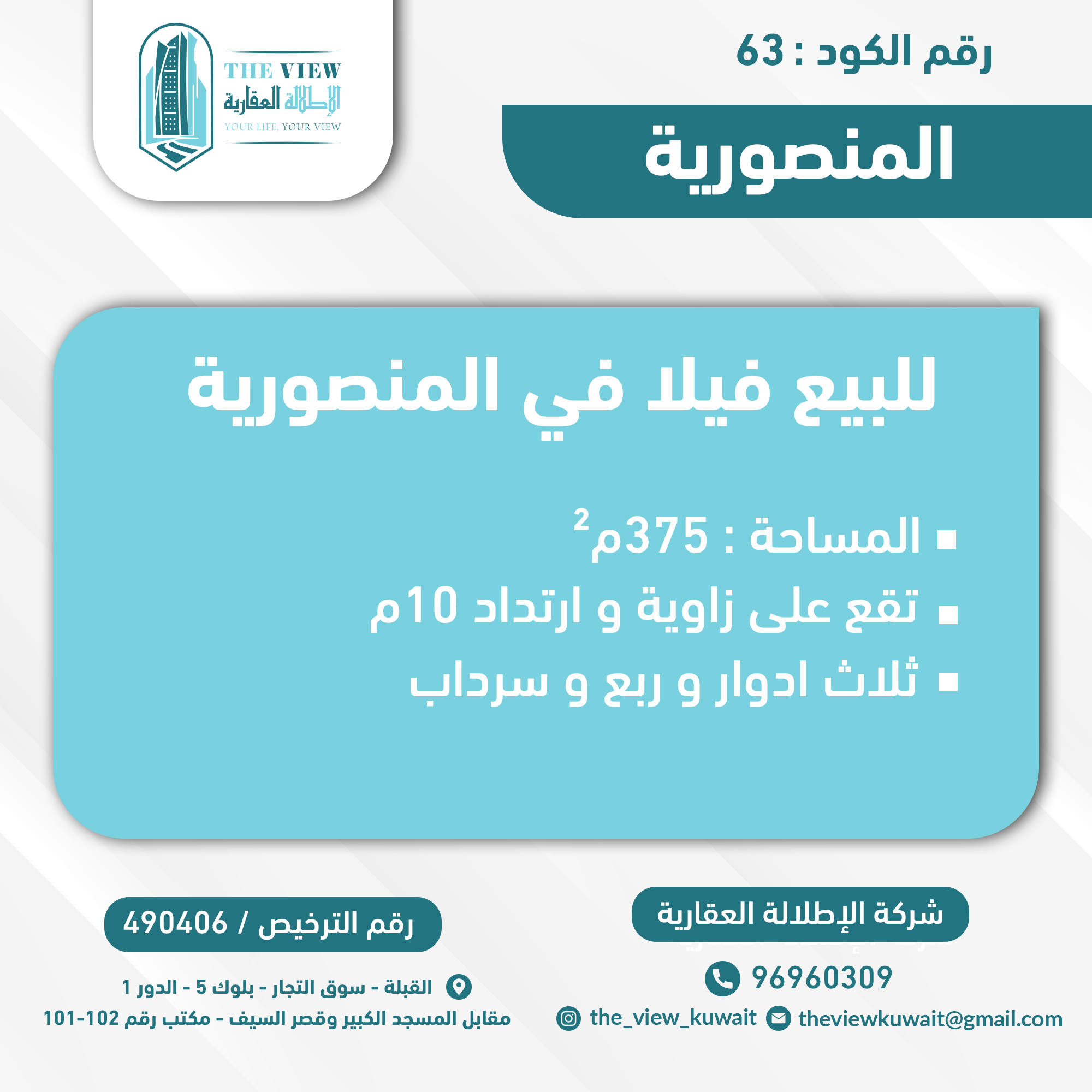 للبيع فيلا فى المنصورية ، مساحتها 375 متر مربع تقع على زاوية و ارتداد 10 متر ، تتكون من ثلاث أدوار وربع و سرداب ، للتواصل 55683559 مهندس محمد