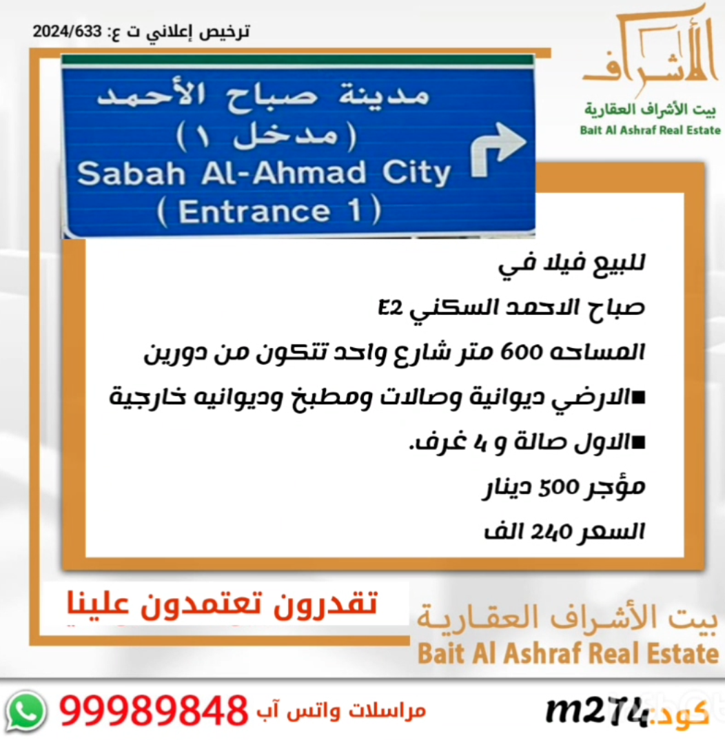 للبيع فيلا فى صباح الاحمد السكنية E2 ، مساحتها 600 متر مربع ، تقع على شارع واحد تتكون من دورين ، الارضي ديوانية وصالات ومطبخ وديوانيه خارجية ، الاول صالة و 4 غرف ، مؤجر 500 دينار ، السعر 240 ألف د.ك .