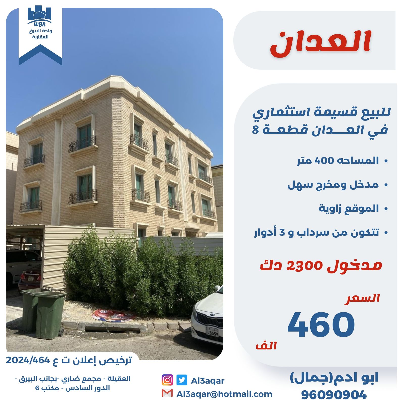 للبيع قسيمة إستثماري فى العدان Share ملخص للبيع قسيمة إستثماري فى العدان قطعة 8 ، مساحتها 400 متر مربع ، مدخل ومخرج سهل موقع زاويه ، تتكون من سرداب و 3 أدوار ، مدخول 2300 د.ك . السعر 460 ألف د.ك . التفاصيل حالة: للبيع Page Views الأماكن القريبة من جوجل خصائص ذات صلة للبيع تجربة عنصر للبيع abdulrahman منذ 3 أسابيع للبيع د.ك111111 شقة تجربة عقار جديد خليل بوست أسرة: 666666 الحمامات: 666666 admin منذ 4 أسابيع Close