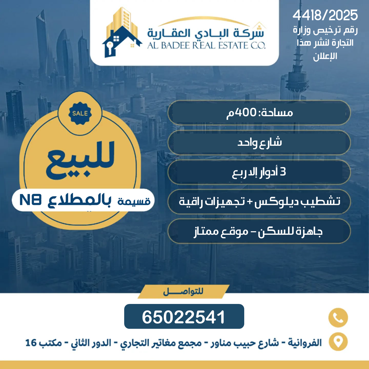 للبيع قسيمة فى المطلاع N8 ، تقع على شارع واحد ، تتكون من 3 أدوار إلا ربع ، تشطيب ديلوكس و تجهيزات راقية بكفالات ، الدور الثاني شقة مستقلة بمدخل خاص ، جاهزة للسكن ، موقع ممتاز .