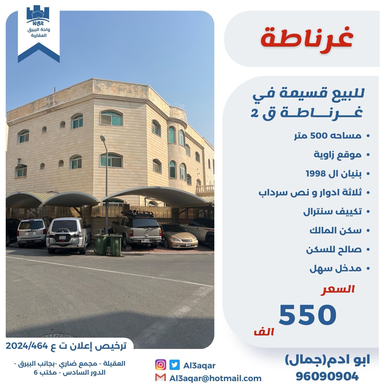 للبيع قسيمة فى غرناطة قطعة 2 ، المساحة 500 متر مربع ، الموقع زاوية ، بنيان ال 1998 ، تتكون من ثلاثة ادوار ونص سرداب ، تكييف سنترال ، سكن المالك ، صالح للسكن ، مدخل سهل ، السعر 550 ألف د.ك