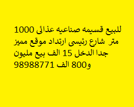 للبيع قسيمة صناعية غذائي بالشويخ الصناعية Share ملخص للبيع قسيمة صناعيه عذائى ،مساحتها 1000 متر مربع، تقع على شارع رئيسى ارتداد موقع مميز جدا الدخل 15 ألف د.ك البيع مليون و800 ألف د.ك . للتواصل 98988771 التفاصيل حالة: للبيع Page Views الأماكن القريبة من جوجل خصائص ذات صلة للبيع تجربة عنصر للبيع abdulrahman منذ أسبوعين للبيع د.ك111111 شقة تجربة عقار جديد خليل بوست أسرة: 666666 الحمامات: 666666 admin منذ 3 أسابيع Close