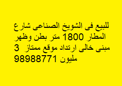 للبيع فى الشويخ الصناعى ، شارع المطار ، مساحتها 1800 متر مربع ، تقع على بطن وظهر ، مبنى خالى ارتداد ، موقع ممتاز ، السعر 3 مليون د.ك 98988771