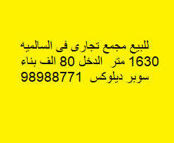 للبيع مجمع تجارى فى السالميه Share ملخص للبيع مجمع تجارى فى السالميه ، مساحته 1630 متر مربع ، الدخل 80 ألف دينار ، بناء سوبر ديلوكس . للتواصل 98988771 التفاصيل حالة: للبيع Page Views الأماكن القريبة من جوجل خصائص ذات صلة للبيع تجربة عنصر للبيع abdulrahman منذ أسبوعين للبيع د.ك111111 شقة تجربة عقار جديد خليل بوست أسرة: 666666 الحمامات: 666666 admin منذ 3 أسابيع Close
