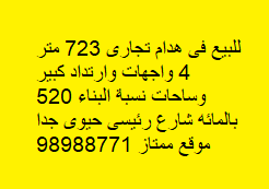 للبيع هدام تجارى فى شرق ، مساحته 723 متر مربع ، يقع على 4 واجهات وارتداد كبير وساحات ، نسبة البناء 520 بالمائه ، شارع رئيسى حيوى جدا ، موقع ممتاز ، 98988771