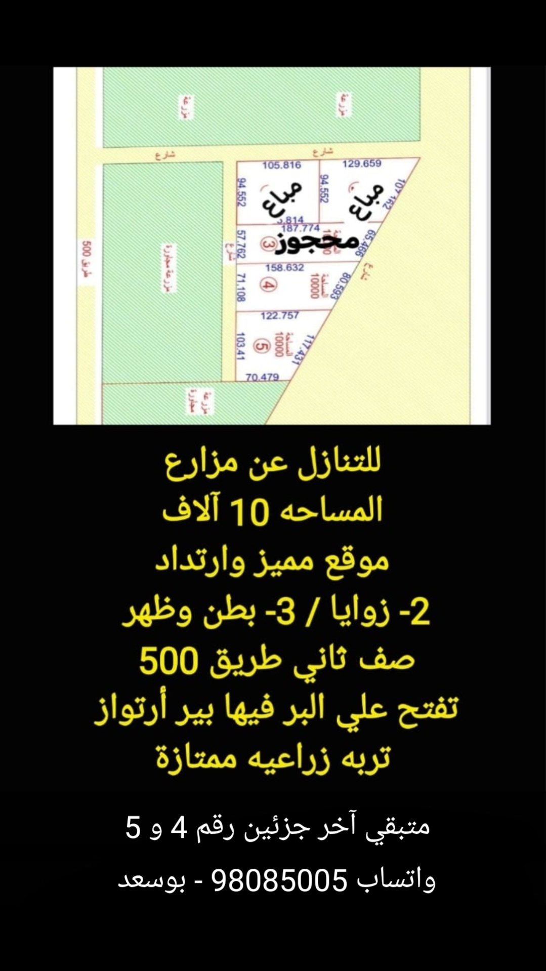 للتنازل عن مزارع بالوفره موقع مميز Share ملخص للتنازل مزارع بالوفره ، المساحه 10 آلاف متر مربع ، موقع ممتاز ، تفتح علي البر طريق 500 ، للاستفسار واتساب 98085005 التفاصيل حالة: للبيع Page Views الأماكن القريبة من جوجل خصائص ذات صلة للبيع تجربة عنصر للبيع abdulrahman منذ أسبوعين للبيع د.ك111111 شقة تجربة عقار جديد خليل بوست أسرة: 666666 الحمامات: 666666 admin منذ 3 أسابيع Close