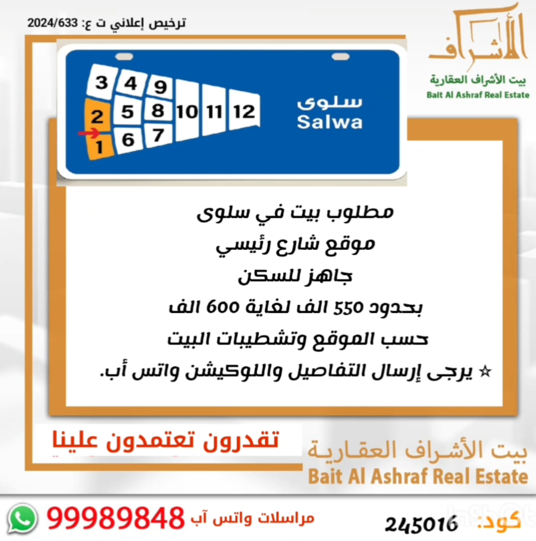 مطلوب بيت للبيع فى سلوى موقع شارع رئيسي جاهز للسكن بحدود 550 ألف لغاية 600 ألف د.ك حسب الموقع وتشطيبات البيت ، يرجى إرسال التفاصيل واللوكيشن واتس أب.